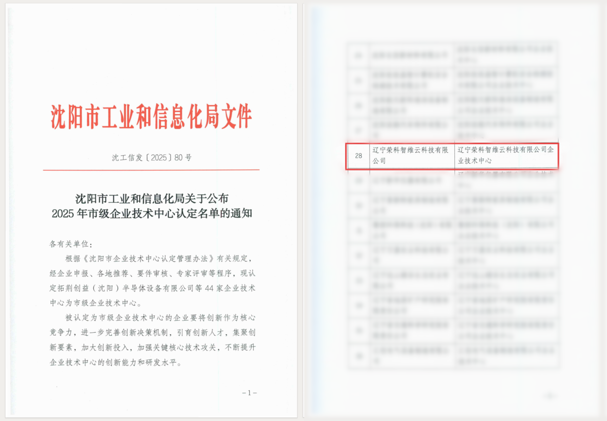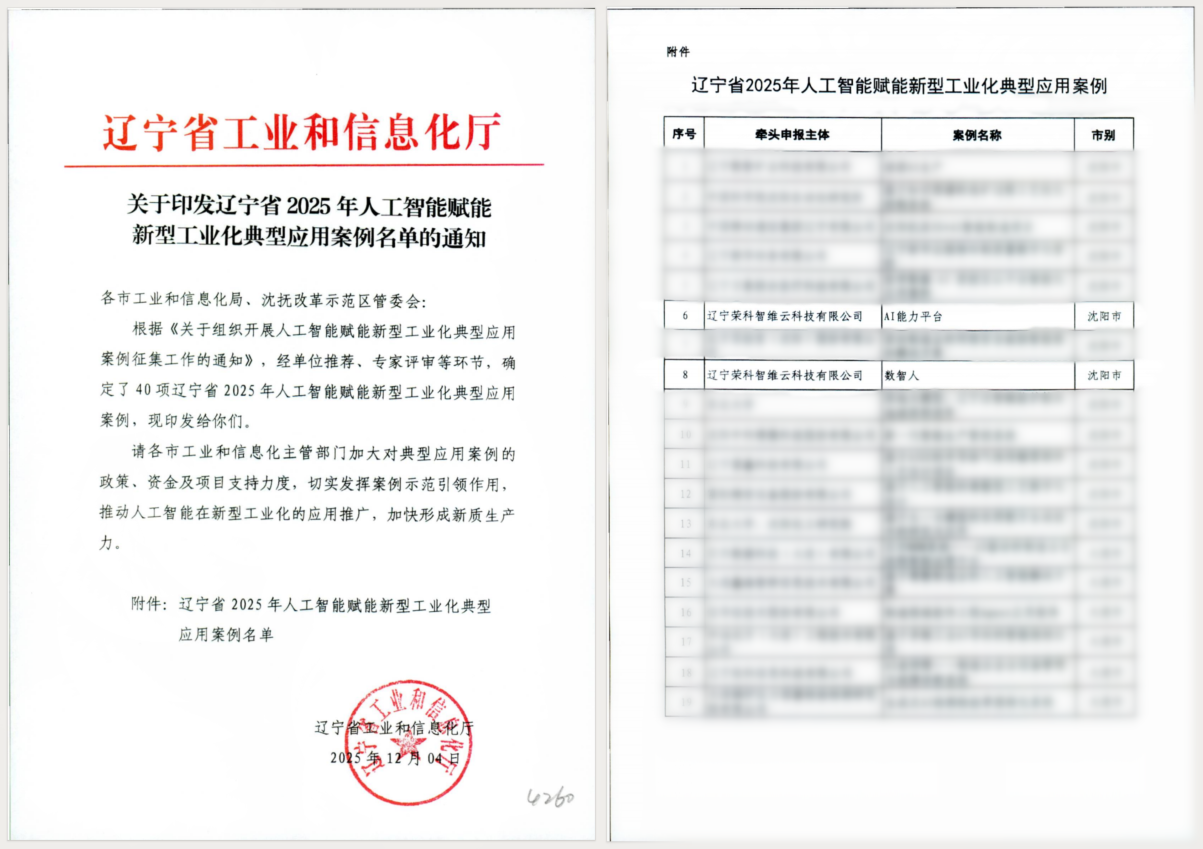 近日,辽宁荣科智维云科技有限公司(荣科旗下子公司,以下简称“荣科智维云”)创新研发实力再获权威认可,双喜临门!公司凭借卓越的技术创新体系与研发成果,成功通过“沈阳市企业技术中心”认定;同时,公司自主研发的“数智人”与“AI能力平台”两款核心产品,双双入选“辽宁省2025年人工智能赋能新型工业化典型应用案例”。这标志着公司在人工智能技术攻关、产品创新及赋能产业转型升级方面取得突破,获省、市两级肯定,也是积极响应国家“十五五”规划关于“推动人工智能产业高质量发展、深化人工智能场景应用”战略部署的生动实践,彰显企业使命担当。